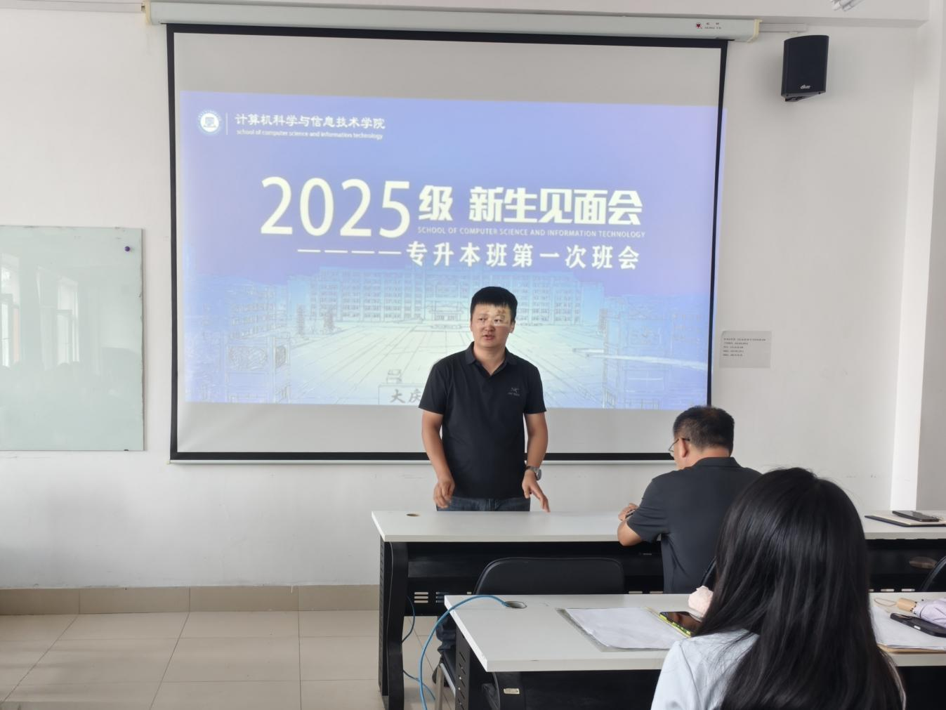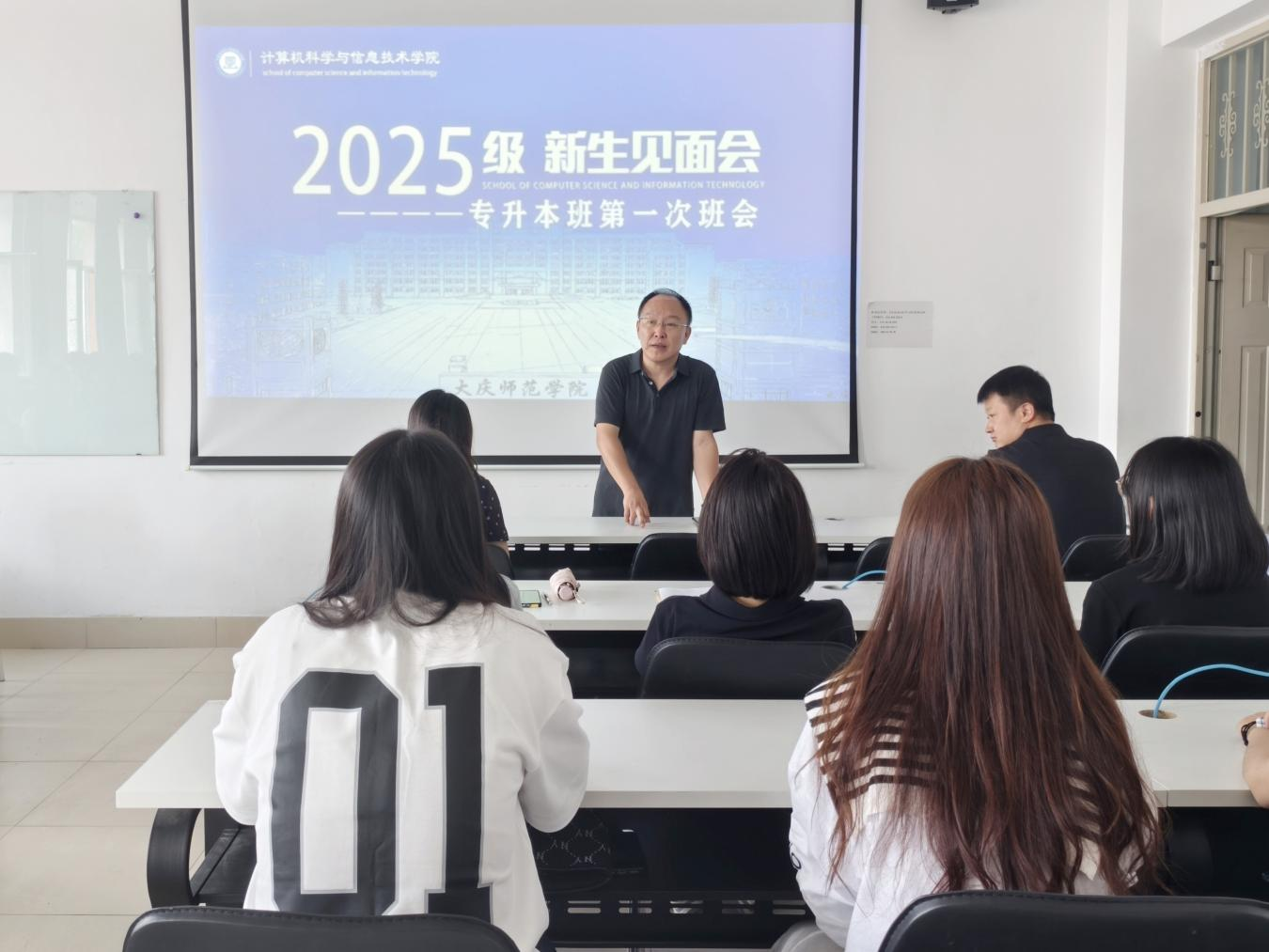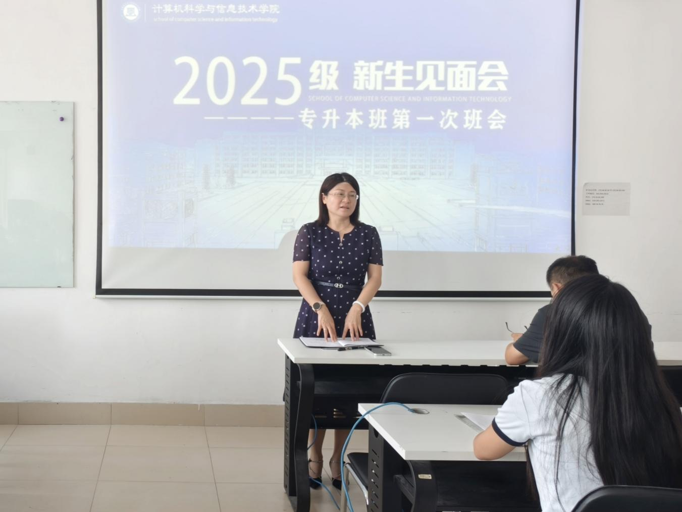 为帮助2025级专升本新生快速熟悉学院环境、明确学习生活方向,8月31日,计算机科学与信息技术学院在计算机楼306教室召开专升本新生见面会,本次会议由辅导员闫令文主持。院长王健、学院党总支副书记刘彰基、副院长贾美娟、副处级辅导员吴鹏、学生工作办公室副主任苏鸿鹏、全体辅导员与专升本新生共同参加。