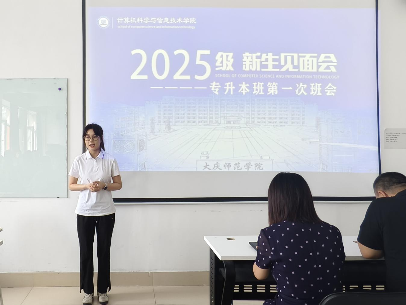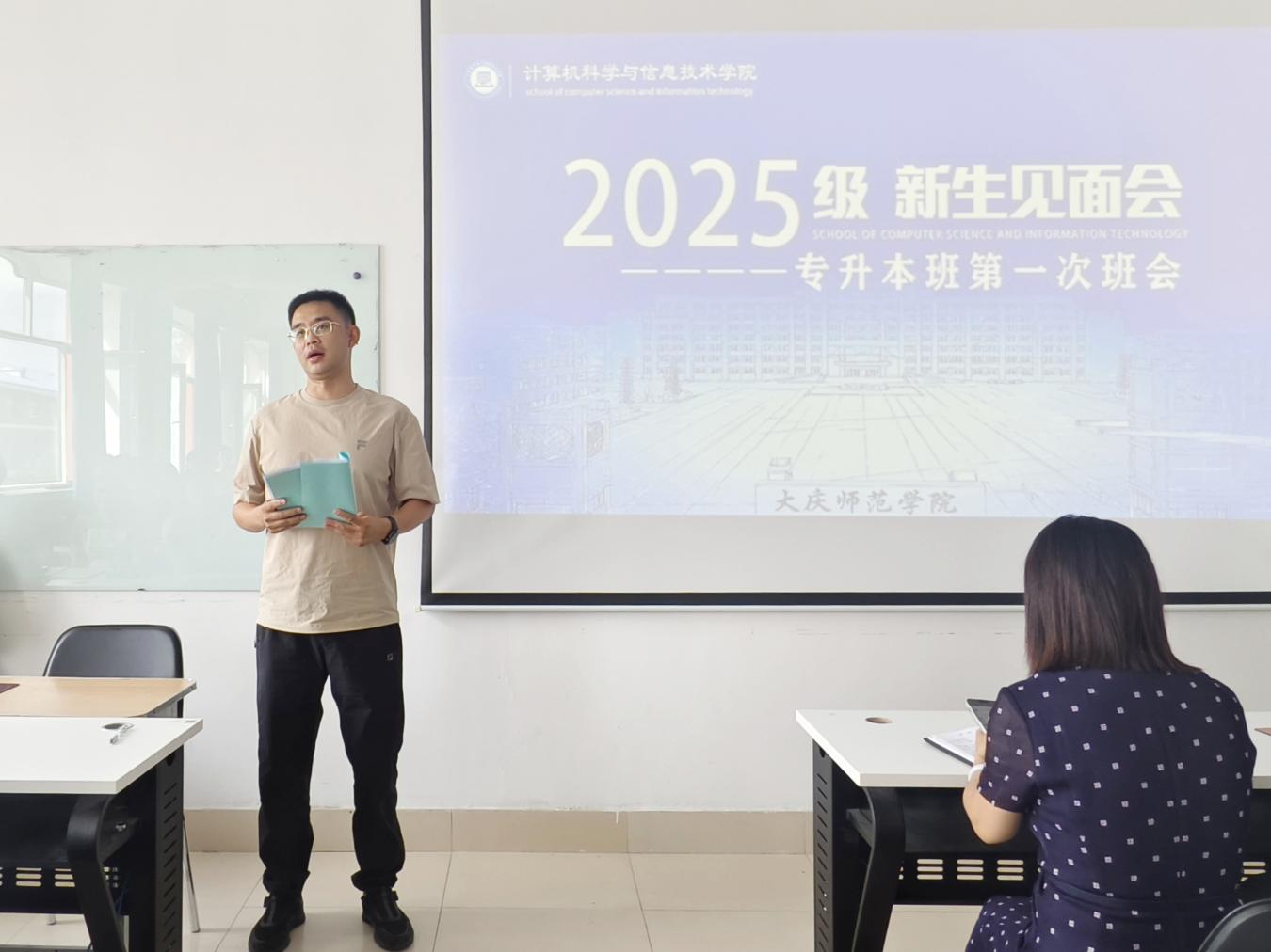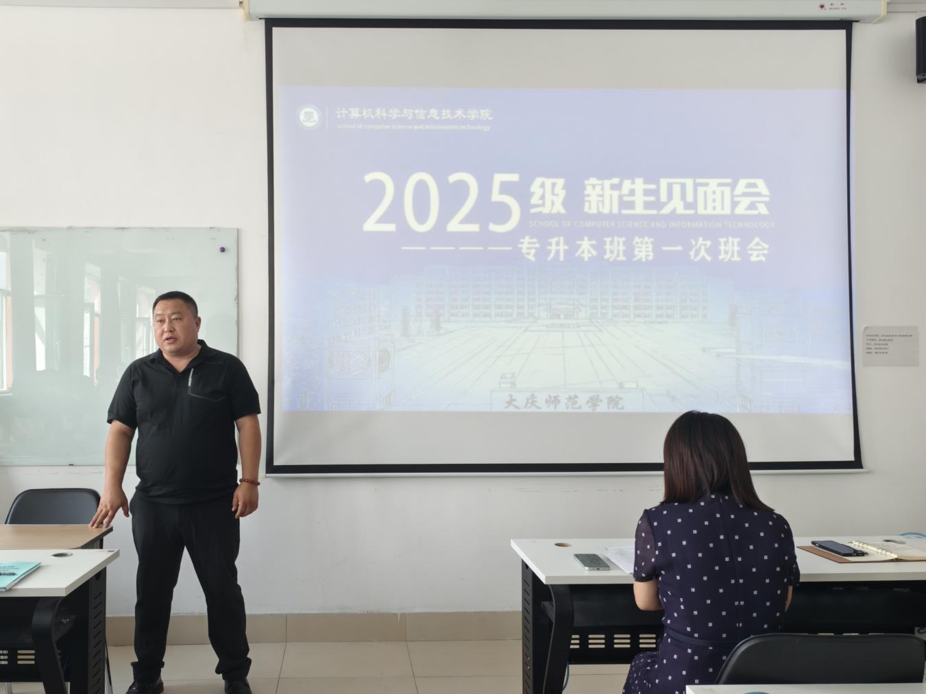 为帮助2025级专升本新生快速熟悉学院环境、明确学习生活方向,8月31日,计算机科学与信息技术学院在计算机楼306教室召开专升本新生见面会,本次会议由辅导员闫令文主持。院长王健、学院党总支副书记刘彰基、副院长贾美娟、副处级辅导员吴鹏、学生工作办公室副主任苏鸿鹏、全体辅导员与专升本新生共同参加。