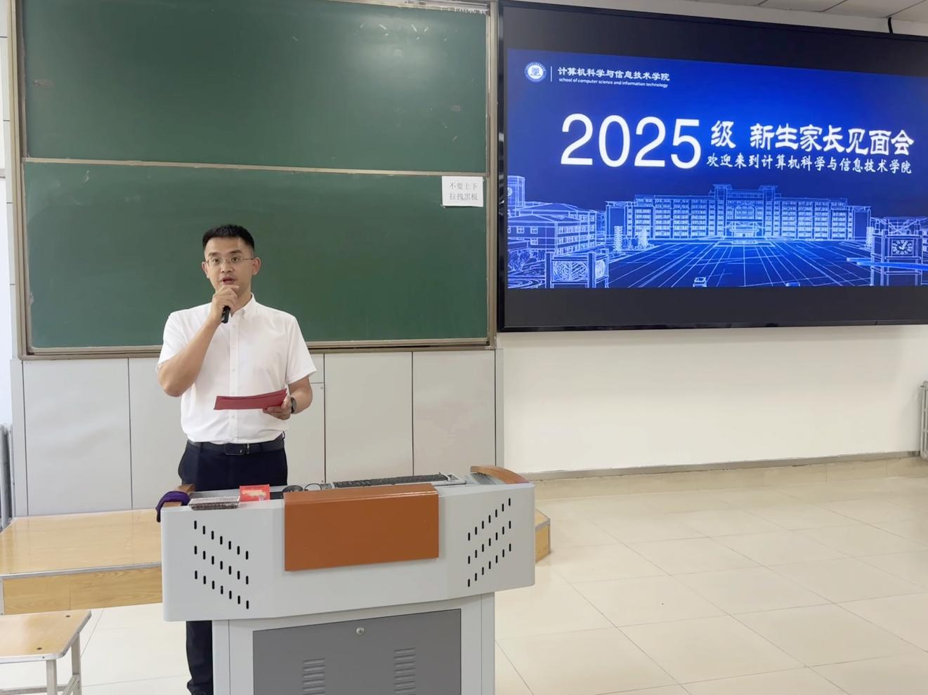为进一步搭建家校沟通桥梁,做好新生教育管理工作,共同为新生营造良好的成长环境,9月6日,计算机科学与信息技术学院召开2025级新生家长会。院长王健、党总支副书记刘彰基、副处级辅导员吴鹏、学生工作办公室副主任苏鸿鹏出席会议,部分2025级新生家长参会,会议由苏鸿鹏主持。