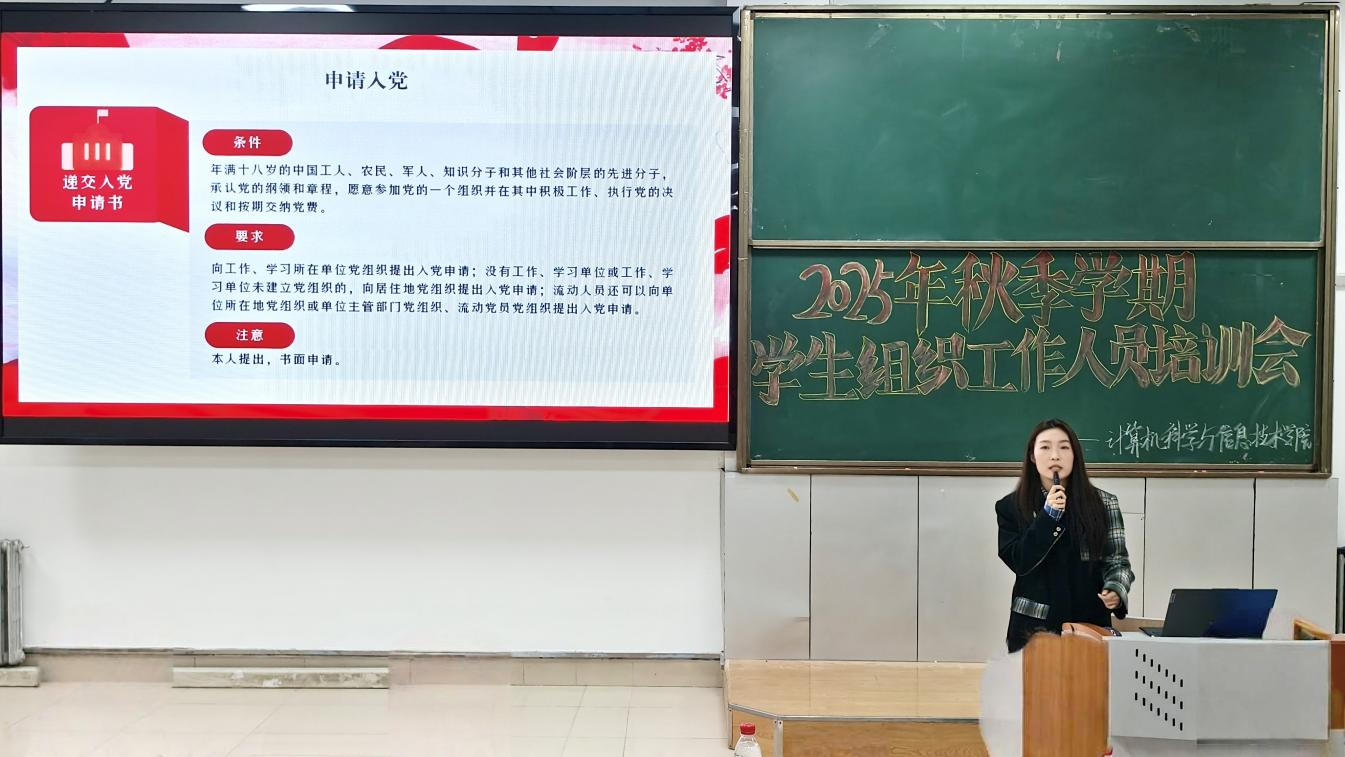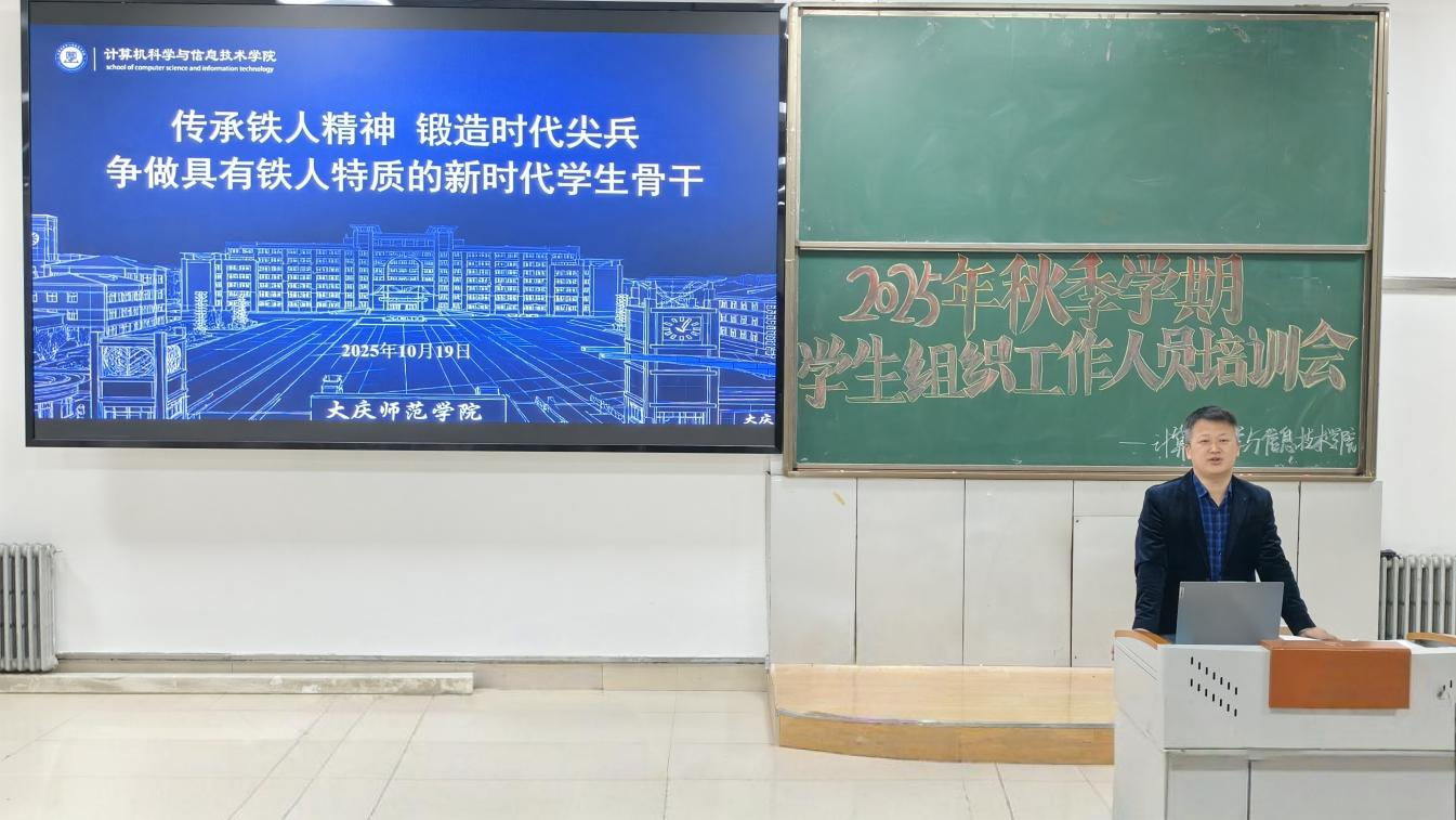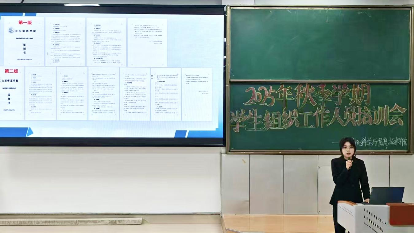 为加强学生骨干队伍建设,提升学生骨干综合素质和工作能力,10月19日,计算机科学与信息技术学院在计算机楼113教室召开2025年秋季学期学生骨干培训会。本次培训会由2022级辅导员刘烁主持,党总支副书记刘彰基、副处级辅导员吴鹏、学生工作办公室副主任苏鸿鹏、2024级辅导员闫令文、2023级辅导员秦莹、组织员姜怡楠和全体学生骨干参会。