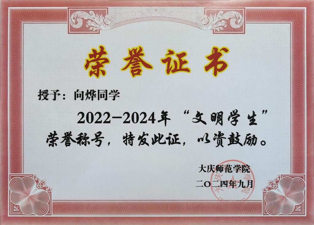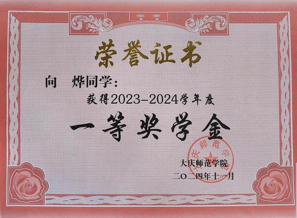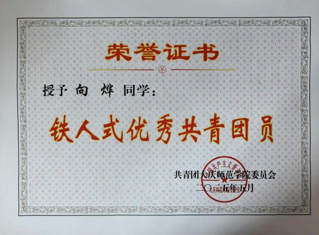 曾荣获国家奖学金、校级一等奖学金,获评黑龙江省三好学生、校铁人式优秀共青团员等多项荣誉称号;大一期间先后通过了英语四六级考试;获2025年“建行杯”中国国际大学生创新创业大赛黑龙江赛区铜奖、2025年中国大学生计算机设计大赛国赛三等奖、第十六届蓝桥杯大赛黑龙江赛区 Web 应用开发大学组二等奖等省级及以上奖项7项,获软件著作权1项;担任院数字媒体中心副部长与班级权益委员期间,工作尽责,协调有力;积极投身志愿服务,志愿服务累计69小时,同时系国家级“两弹一星”志愿服务团队成员,参与多场宣讲。