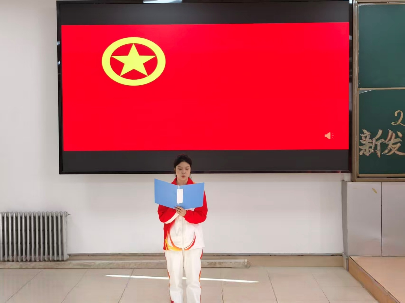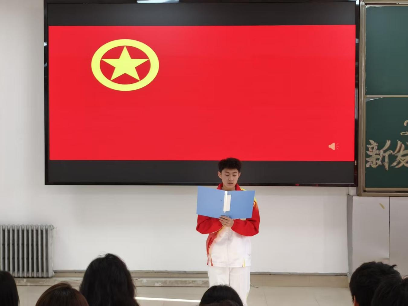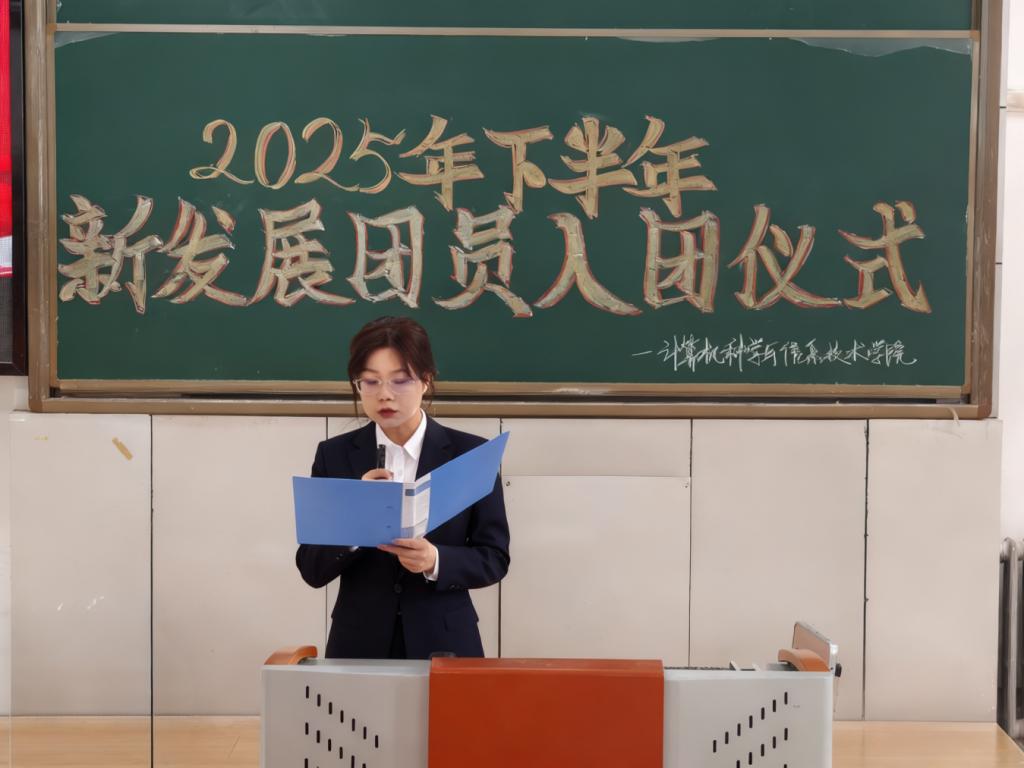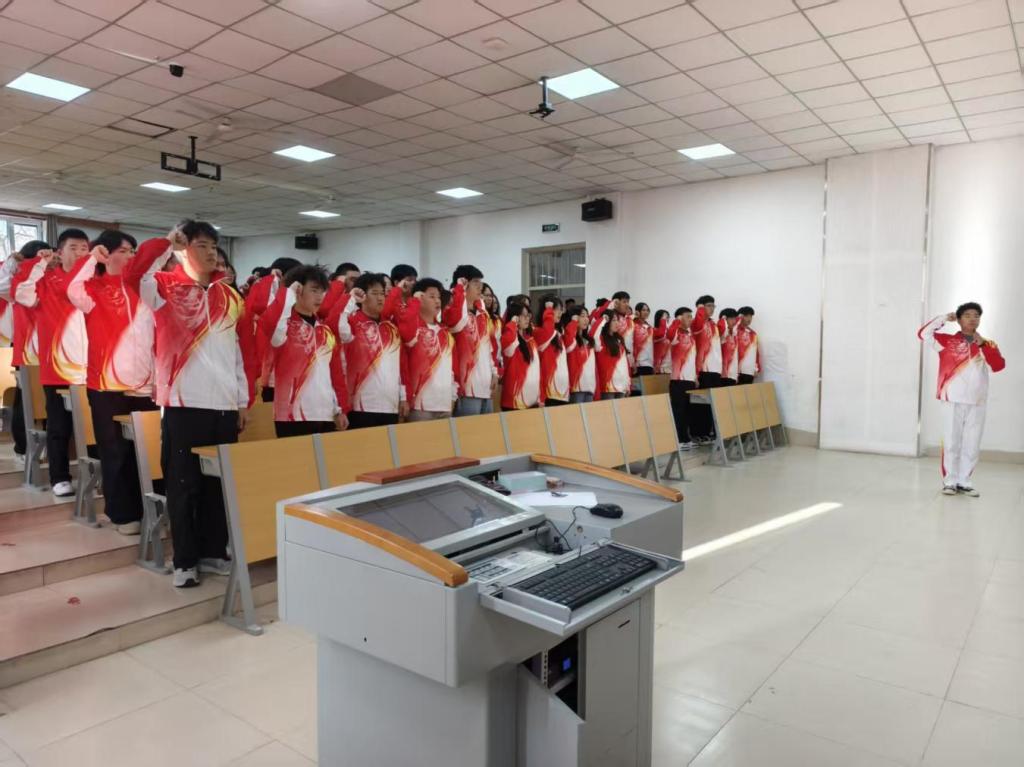 秦莹向新团员提出要求与期许:一要牢记使命,坚定理想信念,勇担时代责任;二要不忘初心,恪守入团誓言,践行青春使命;三要摒弃私念,胸怀集体大局,严于律己修身,争做合格优秀共青团员。最后,全体同学起立,奏唱《中国共产主义青年团团歌》。激昂的旋律响起,新团员们用歌声表达对共青团组织的热爱与忠诚,展现了新时代青年奋发向上的精神风貌。