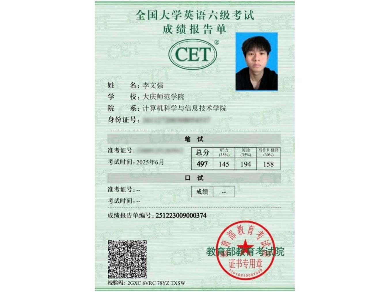 李文强,计算机科学与信息技术学院软件工程专业学生,以初试338分、专业排名第七的成绩被南昌航空大学软件工程专业录取,攻读硕士学位。在校期间,专业成绩位列前茅,共计15门课程成绩达90分以上,曾荣获“铁人式优秀共青团员”等荣誉称号。具备扎实的英语能力,大学英语四六级均以高分通过。