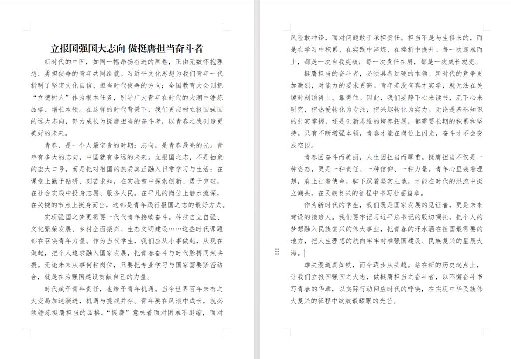 为厚植家国情怀、砥砺奋斗之志,我院组织开展“立报国强国大志向 做挺膺担当奋斗者”主题征文活动。同学们围绕核心主题开展创作交流,以笔墨为桥梁、以文字为载体,结合自身感悟与青春视角,涌现出一批立意深刻、情感真挚的作品。作品中既有对报国初心的深情抒发,也有对奋斗担当的生动诠释,充分彰显了新时代青年的理想信念与使命情怀。